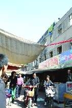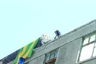 ▲楼顶施工无防护措施。楼下便是商铺和来往行人。张牟幸子 王景坤 摄