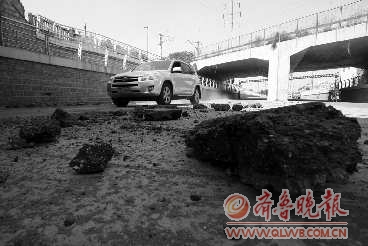 21日,在潍坊市鸢飞路铁路桥下近百米的道路上布满了大大小小的石块。在现场,路面上散落着大小不一的黑色石块,最大的直径在半米左右,小的直径也在20厘米以上,每当有车辆经过的时候,破碎的石块都会扬起一阵灰尘。路面上布满的石块给过往的车辆造成了诸多不便。