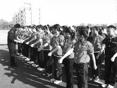 21日,晨阳学校的操场上,在东营市特警支队工作的家长义工和队员们为孩子们上了一堂“军训”课。东营特警支队张队长说:“这种活动不仅可以了解孩子在学校的情况,还有助于家校共建。” 本报记者 李沙娜 本报通讯员 曹月 摄影报道