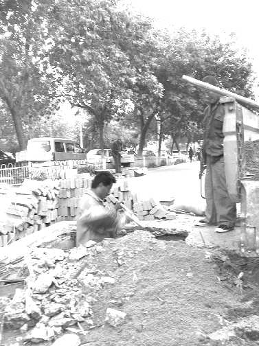 21日下午5点左右,记者在胶州路嘉士利蛋糕店门口看到,穿着“东营供水”工作服的几位工作人员正在修补丢失的井盖,周围还放着车装的沙子、水泥及新井盖等,一位工人师傅介绍说他们是东营市自来水公司的工作人员,接到市民反映及看到报纸报道后就过来了,他说:“原来是个方形井盖,现在要改装成圆形,再放上新井盖。”