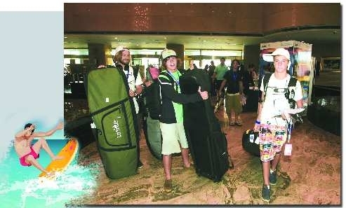 21日,市区蓝海国际大酒店一楼大厅的接待处很是热闹。前来参加世界杯滑水赛的运动员们陆续抵达报到。下午5时许,中国选手乘飞机抵达临沂并向赛会报到。