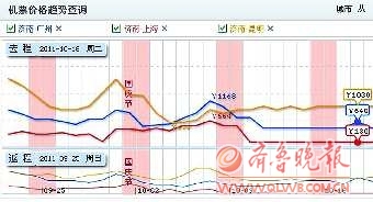 自10月12日以后,以上机票价格飞流直下,有的直跌进两折左右的低谷。其中,济南至上海的机票价格低至130元,这比目前济南至上海400元的高铁票价便宜了一半还多。