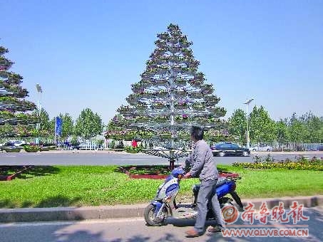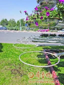 为迎接国庆节的到来,历下园林部门在经十东路绿化带内摆放了多个花架(下图)。22日,记者看到,多个花架上的景观花被人挖走,有的还连同不锈钢花盆一同消失(右图)。不少市民对此很是气愤。 本报记者 尉伟 实习生 霍琼 摄