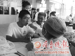 22日上午9点30分,青岛恒星职业技术学院近百名学生在食堂门口排队等待造血干细胞标本的采集。名叫贾东宁的学生第一个填完志愿捐献表来到