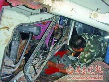 21日下午6时55分,庆云县尚堂镇高架桥西300米处一辆挖掘机侧翻,油箱漏油,一人被困。消防队员赶到后,利用破拆器材将被卡驾驶室的司机救出。