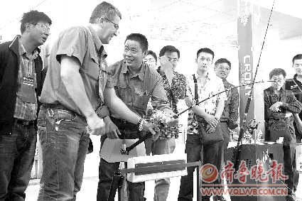 “这太奇妙了!”在展览中心A馆,一名外商对展示的钓鱼模拟测试器展现出浓厚的兴趣。这款模拟器模拟了钓鱼的真实环境,使用者操作鱼竿和观察屏幕,可以感受到真实的钓鱼体验,并可以用于渔具企业测试渔具的质量。在展会现场,前来体验的人络绎不绝,当天就预定处五台机器。