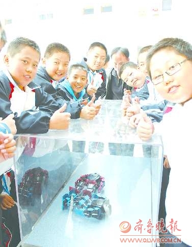 “这个是勾股定理演示设备,可以看到三角形的变化。”六年级的陈卫强告诉记者,虽然他们还没开始学习勾股定理,但是通过这个设备,他已经有了一定了解。机器人永远是男孩子们的最爱,两个机器人表演一开始,一群男孩儿就围了上去,不时地爆发出欢呼声。