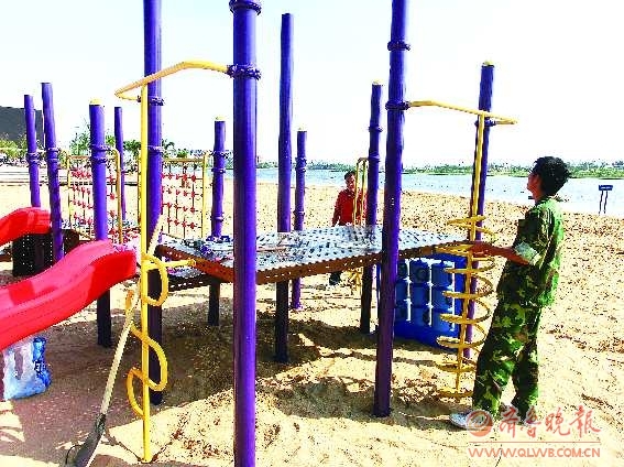 9月21日,记者在清风湖北沙滩上看到,工作人员正在沙滩上安装滑梯、绳桥等儿童游乐设施。据现场工作人员介绍,清风湖风景区在湖边新安装5套儿童游乐设施,预计于5日内完成安装。