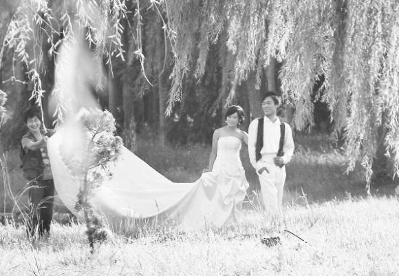 22日下午4点多,一对情侣在东昌湖边拍婚纱照。不少情侣扎堆“十一”结婚,最近每天都有四五十对情侣在湖边留下甜蜜的身影。 本报记者 邹俊美 摄影报道
