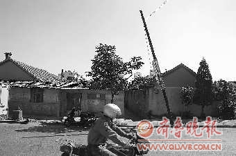 陈先生指着路边民房上的线路告诉记者:“这根线杆在这里已经有五六年的时间了,前几天刮大风被刮成了这样,现在这根电线杆就只靠路两边的电线给拉着,要不早就倒了。”