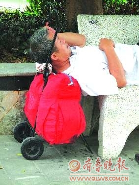 作品描述:此人身体睡在石凳上,头部则枕着随身