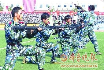 24日,山东大学举行2011级学生军训阅兵典礼,学生表演了分列式和旗语操、特种兵战术演练等汇报科目。