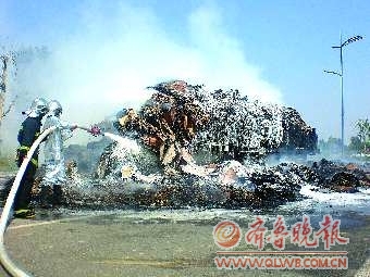 据目击者称,12时10分许,半挂货车行驶至此处时,车斗上纸箱已经起火。司机发现后将车头与车斗分离,驾驶车头逃离。消防人员用钩子将纸箱全部卸下,再用水枪灭火,下午2时30分许,消防人员成功将火扑灭,起火原因目前不明。 记者 韩伟杰 通讯员 赵福军 摄影报道