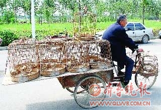 自述:一老人骑三轮车满载鸟笼回家。点评:管“叫”有方。