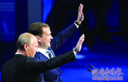 本报讯 一个持续了四年、让西方国家纠结不已的俄罗斯政治谜题当地时间9月24日在莫斯科揭开。综合英美媒体的消息,俄罗斯总统梅德韦杰夫当天宣布,他建议总理普京参加2012年的总统大选。这意味着梅普两人已达成协议,梅德韦杰夫将放弃连任,普京在时隔四年后将重回总统宝座。