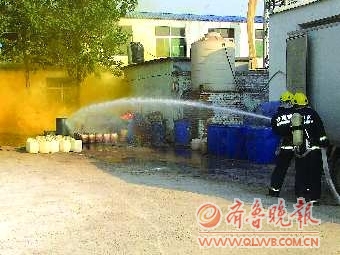 情况紧急,济南公安消防二十中队的官兵迅速出动,并很快来到了104国道北桥村路段一个工厂大院内。现场,阵阵黄烟正从院内的一个大桶内喷涌而出。