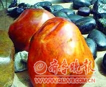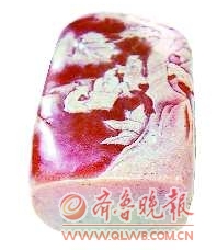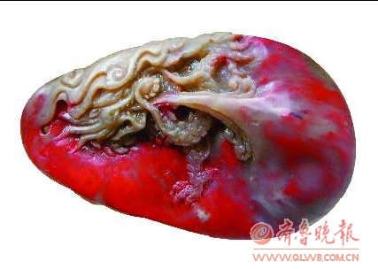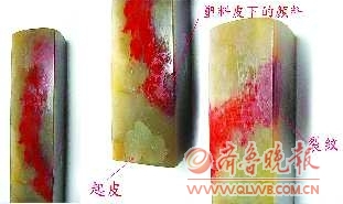 由于用石粉与朱砂混合的方法易鉴别,因此,作伪者又找出了更逼真的作伪方法。“他们把真的鸡血石锯成带血的石皮,包在石头上。”郑伟介绍。