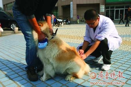 25日,在天福苑广场,市动物疫病预防与控制中心工作人员正在给社区的狗注射疫苗。据了解,犬类狂犬病免疫进社区便民服务活动在全市各小区广场陆续展开,市民可就近为爱犬注射狂犬疫苗,每次收取工本费10元。