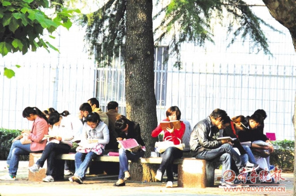 25日,在泰安市实验学校考点附近,参加2011年泰安市事业单位公开招聘考试的考生们入场前依然加紧复习。