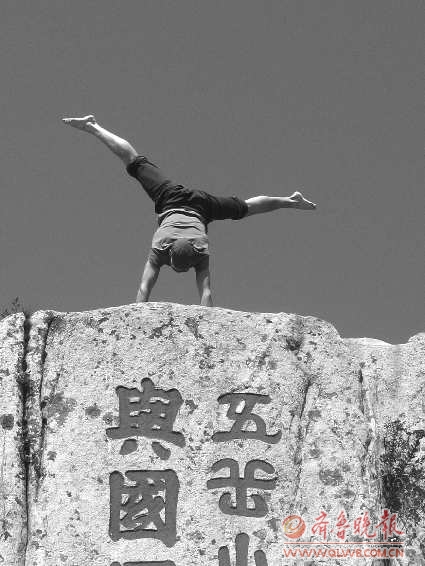 25日上午10点,在泰山的大观峰的石刻前,众多游客正忙着拍照留念,突然有游客喊了起来:“看!上面有人在倒立!”随着喊声,记者看到,在大观峰石刻的顶部,一个人正头下脚上倒立在悬崖边。虽然山上风很大,但是倒立者仍纹丝不动。大观峰上的游客叫好声、掌声不断。随后,记者又看到,倒立者沿着大观峰的悬崖边一路察看地形,在看到悬崖上一块刻着“可摘星辰”的巨石时,兴致上来的他用脚蹬了蹬巨石,并准备往上爬,可是被工作人员拦下,他只能扫兴地摇了摇头。