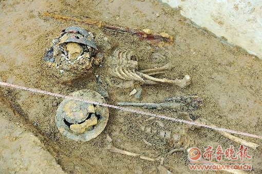 9月23日,在台儿庄古城西门城墙下,清理水系的施工人员发现了两具头戴钢盔的尸骨残骸。台儿庄古城管委会随即对现场进行了保护,并邀请枣庄市博物馆的考古专家进行了保护性挖掘。现场专家称,仅从目前已发现的头盔、大刀、枪支等遗物和遗骨残骸来看,已经很难判断这两具尸骸生前到底是中国将士还是侵华日军。
