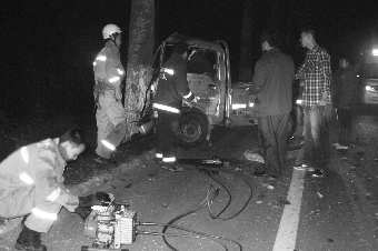 本报9月25日讯(通讯员 王磊 记者 鞠平) 9月23日凌晨,招远一辆农用黑豹汽车撞上路边大树,车头严重变形卡在树上,车内两人被困。经过20多分钟的努力,招远消防中队将他们成功救出。