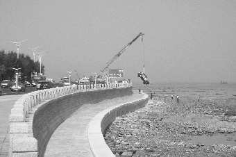 25日中午1点,记者在海滨中路新城北街站点看到,一辆吊车正在吊起落在海边礁石区的受损现代车。现代车两侧车门的玻璃几乎全部掉落,前挡风玻璃呈粉碎状,车辆左侧顶面、侧面凹陷严重。拖车后侧还有一辆受损的凯越车,车灯保险杠都已损坏,车头右侧凹陷。