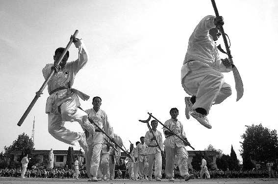 只见他们或站立前行,或蹲走,手中的十八般兵器上下飞舞。“布阵”以后,首先是“李逵”使双斧,接着“徐宁”使开钩镰枪,“刘唐”抡着扑刀,“解珍”、“解宝”飞舞托天叉……郓城“梁山好汉”和来自台湾的同胞纷纷上场各自施展本领。