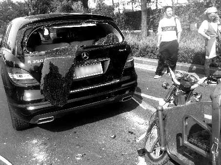 记者从现场看到,事故中的三轮车为一辆电动车,前轮胎已经爆掉,奔驰商务车的后窗玻璃已破碎。随后记者来到第二人民医院,据电动三轮车主李先生介绍,事发时候他刚给饭店送完豆腐,正准备回家,当时他驾驶电动三轮车沿福寿街自东向西行驶,看见前方有车的时候已经来不及躲闪,“当时懵了,不知道为什么撞上的。”李先生的妻子告诉记者,电动车车速也就在30KM/小时左右,哪来的那么大劲把后窗撞碎?