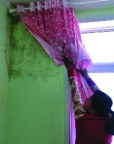 记者来到周女士家所在的19号楼5楼,在北向的卧室里,周女士拉开窗帘,房屋里立刻就漂浮着一股发霉的味道。墙角处近一个平方米面积的墙壁上黑乎乎的,装修时刷的乳胶漆已经被泡翻了起来,与旁边的墙壁对比很明显。周女士说,这已经是清理过后了,发现的时候更严重。现在只要天气好,她就开着窗子快点把那边晾干。