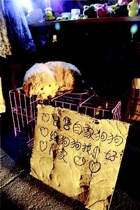 自述:一只小狗趴在笼子上等买主。