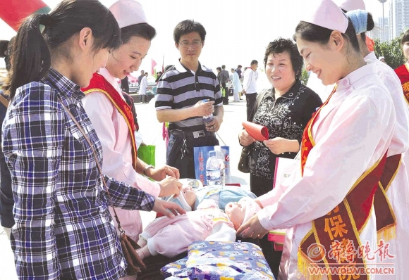 活动以服务好、质量好、医德好,群众满意为主要内容。图为泰安市妇幼保健院的护士正在向市民展示为新