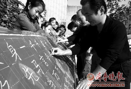 23日,在御碑楼小学校园里,老师在一块长约10米的黑板上写着“为人师表”、“身先士卒”等成语。据悉,学校每位老师到校后,都要在这里写两个成语向学生展示,年底学生还要为老师打分。本报记者 刘丽通讯员 宫玺 摄