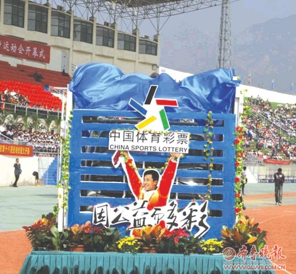 开幕式现场,体育彩票的花车无疑最引人注目:体彩形象代言人奥运冠军王峰、体育彩票各类玩法标志、体彩公益金建成的健身路径把花车装饰得特色十足,体彩风格浓厚。由四位歌手共同演唱的歌曲《相亲相爱》,将整个开幕式推向高潮。在比赛场地外,数百面随风飘扬的体彩顶呱刮黄色旗帜显眼入目,体育彩票的气球垂幅、宣传标语随处可见。
