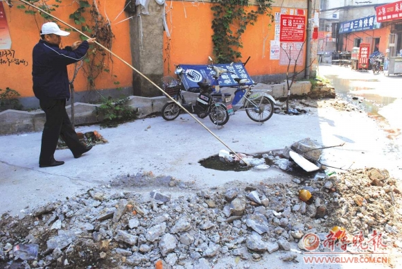 26日,在泰城元宝小区的主要道路上,一条蔓延二十多米的污水带,让小区内的味道十分怪异。在往来车辆碾压下,污水四溅,两侧五六家做餐饮生意的小店老板叫苦不迭。虽然已是中午吃饭时间,但这几家几乎没有生意,一家小吃店刘老板告诉记者,这样的情况已经持续了20多天,生意惨淡让他们很受伤。