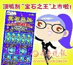 顶呱刮“宝石之王”头奖150万,创即开彩市之最,王者风范令彩市震撼,让广大彩友喜爱不已,亲切地称它为“宝石之王老五”。“宝石之王”玩法众多,一张彩票上有5个游戏,包括找符号、数字匹配、找相同标志等,更有多达26次的中奖机会,定会让你玩得过瘾,中得开心。在奖级设置上,“宝石之王”设有9个奖级,有超过300万张50—30000元的中奖票,“大奖大,小奖多”,真是好玩又好中。