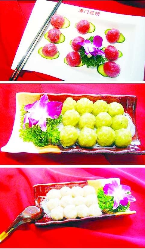 强烈推荐的特色墨鱼滑(29元),很Q很滑很嫩,澳门豆捞的丸滑类是很有特色的菜品。服务员会帮你用小勺分割后放入你的涮锅里。虾丸,因为里面有大大的鲜虾粒,很不错,还有撒尿牛丸也不错的。咬在嘴里还会有汤汁从丸子里溢出,感觉很奇特。丸子咬在嘴里脆脆的、香而不腻。这里记者就不得不讲讲撒尿牛丸的制作了,酒店的厨师长介绍说:“牛丸内包裹的一层是汤汁的固体,是用猪手、老鸡、猪棒骨、金华火腿等原料10小时熬制,使熬制的汤变浓,过滤后自然凝固,凝固后切成方块形,用特制的牛肉包在汤汁里。”就这样,神奇的撒尿牛丸就制成了。精品肥牛系列 肥牛美味而且营养丰富。吃肥牛可以配合海鲜和青菜,海鲜中含有丰富的蛋白质、铁、维生素,营养更丰富,更易于吸收。