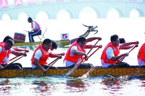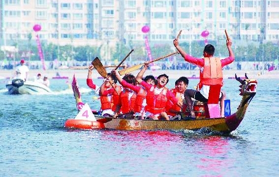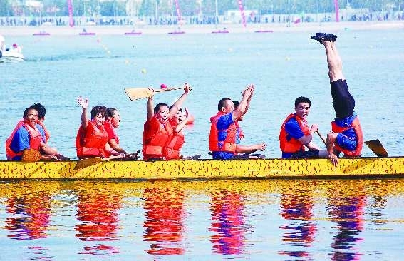 在龙舟赛开幕式之前,包括星光艺术团在内的多支东营市艺术团体表演了精彩的文艺节目。上午9时,龙舟赛正式开始,一时间清风湖上龙舟点点、鼓声震天,斗志昂扬冲过终点的选手欢欣鼓舞,有一名选手兴奋之余竟然在龙舟上玩起了倒立,引起了观众的一片喝彩。