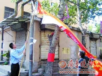 26日上午,市中城管局中心街分局的执法人员正在小区内清理横幅。近期,市中城管局对非法私自悬挂的横幅进行全面清理,维持整洁市容。
