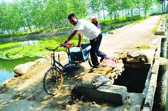 采访时,有几位村民从桥上经过时,小心翼翼地左看右看,生怕车子掉到河里。一位姓刘的大爷对记者说:“这桥太吓人,没栏杆,又有窟窿,下大雨的时候,河水还漫过桥面。”