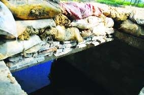 9月25日上午,记者来到苍山县南桥镇界坊村。走近界坊村桥,记者看到,桥的南半部分是用木板搭起来的,4层木板上又铺了一些沙袋,连接起桥的断裂处。桥上的护栏早已不知去向,只剩下一个个矮小的墩子。