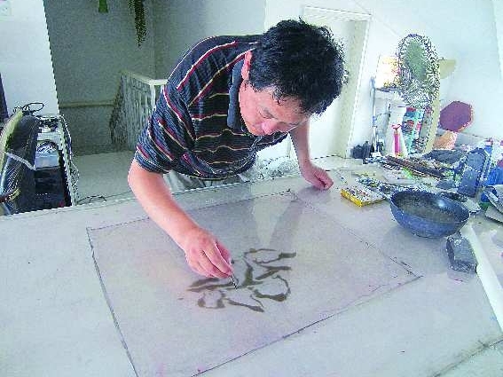为了能静心作画,许光磊将家的阁楼开辟为他的画室。在许光磊的画室里,能感觉到初秋太阳的格外炙热。“气流的任何变化都会影响水纹波动,直接影响成画,天再热也不能开风扇,还要防止汗珠滴到水里。”许光磊说,学习创作水拓画,需要很大的耐力,不能因为环境受影响。