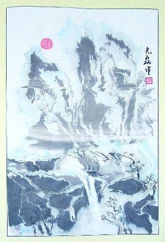 水拓画是用容器装满水,然后在水上点滴墨或调好的颜料,使其在水中自然流动,形成花纹,然后把宣纸轻铺水面,利用宣纸吸收性能好、可留住水痕的特性,进行的一种创作。