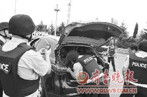 为确保国庆节期间良好的全区社会治安秩序,27日起崂山警方全警动员,每天在重点区域和景区投入200余名警力展开治安巡控。图为崂山警方持枪对过往车辆进行检查。