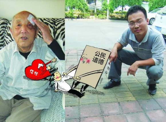 左图:被救老人傅明瑚在家休息,头上的伤口还包着纱布。