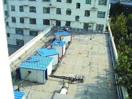 记者来到一楼的银座佳驿连锁酒店,酒店工程人员邓利强告诉记者,楼顶上的五个小屋是他们酒店的水塔,其中稍大一点的屋内装有两个电机。