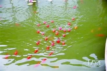 作品描述:池塘里的金鱼正在进行罕见的列队表演。