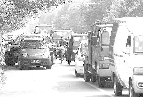 9月27日,记者在胶州路上看到,停靠在路边的车辆占去原本就不宽的道路的大半,四车道变成了双车道,造成了道路的拥挤,交通高峰时段,骑车的市民都难以从车缝中穿过。 本报记者 段学虎 摄影报道