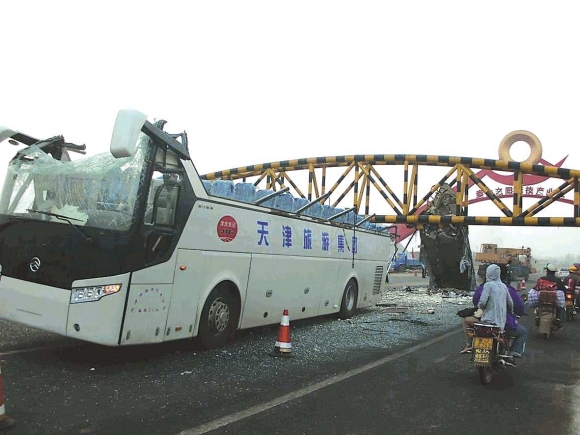 27日早5时左右,104国道泰曲段大汶口大桥南侧,一辆崭新的大巴车撞