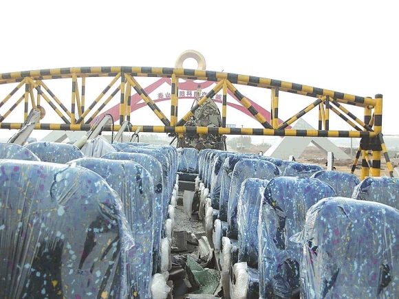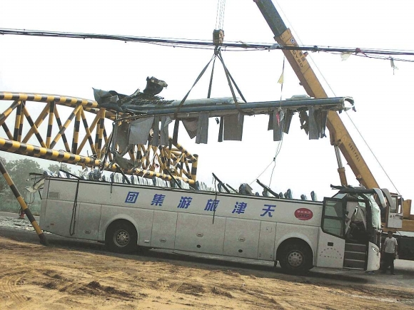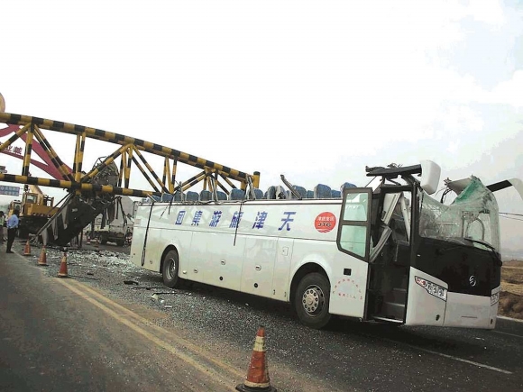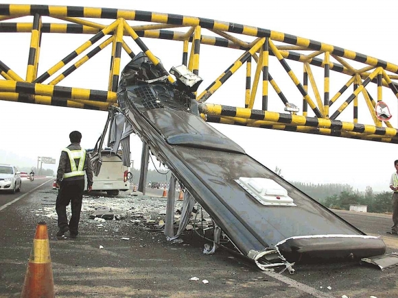 27日清晨5时许,104国道泰曲段大汶口大桥上,上演惊险一幕,一辆由厦门发往天津的崭新大巴车,在经该路段一限高钢架时,由于车速太快,刹车不及,被“卡”掉整个车顶,变成了“敞篷车”,所幸车上没有乘客。